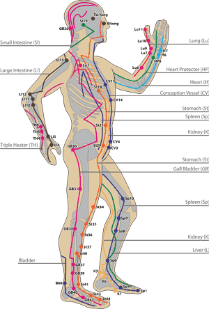Meridians are channels that run throughout your entire body through which energy flows. They are the energy lines that acupuncturists are working on when they insert needles into specific points around your body. And I know some of you reading the will shiver at the thought of a needle, but the good news is that Kinesiologists don’t use needles! Below is a diagram of all the Meridian energy channels, where they are located, and what they refer to within the body: